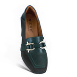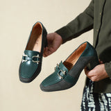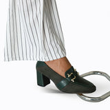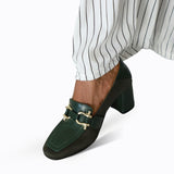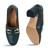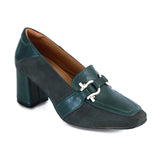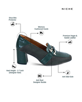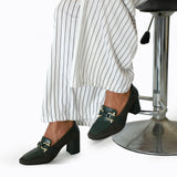 WOWW! That's what comes to your mind when you see them, MINDBLOWING! Thats't what you say when you wear them. This green trendy color with mix of suede and smooth vegan leather with horsebit style buckle on the vamp will add a bling to your outfit. These Pumps are a must have for office wear to coffee outing to date night. With those block heel & memory cushioning comfort, you can take them to club nights as well